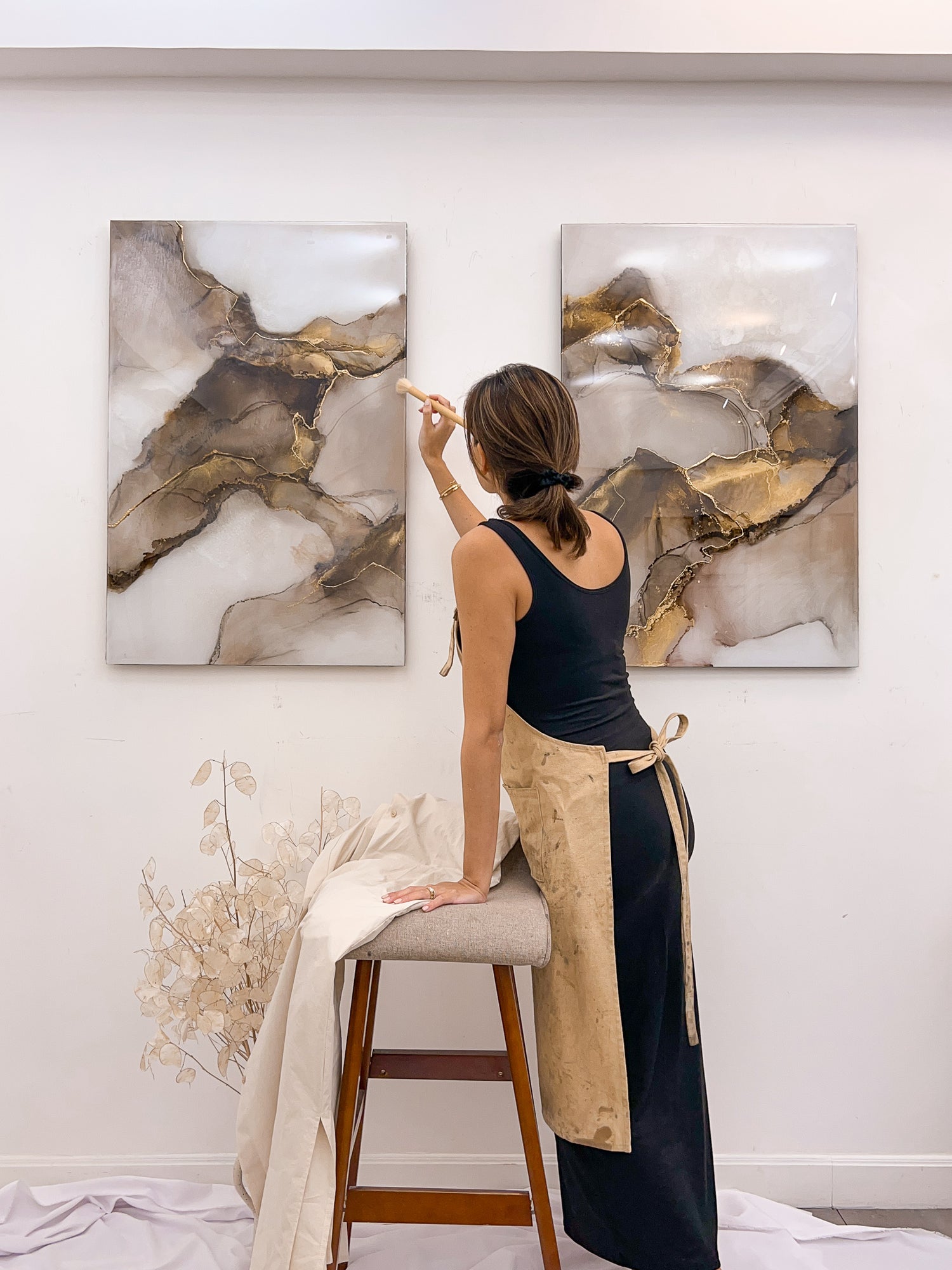 Ink is the perfect metaphor to explore the tension between precision and freedom, where color moves freely across the canvas, evolving as it meets and responds to Chiang’s artistic intention. The use of resin offers new opportunities to add and subtract from the work, investigating texture and opacity. Depth is created over multiple layers of interplay between ink, resin, and gold leaf accents, drawing the viewer in to examine and inspect unexpected moments of intricacy and complexity. The artwork transforms into a powerful, compelling whole, achieving harmonious balance.