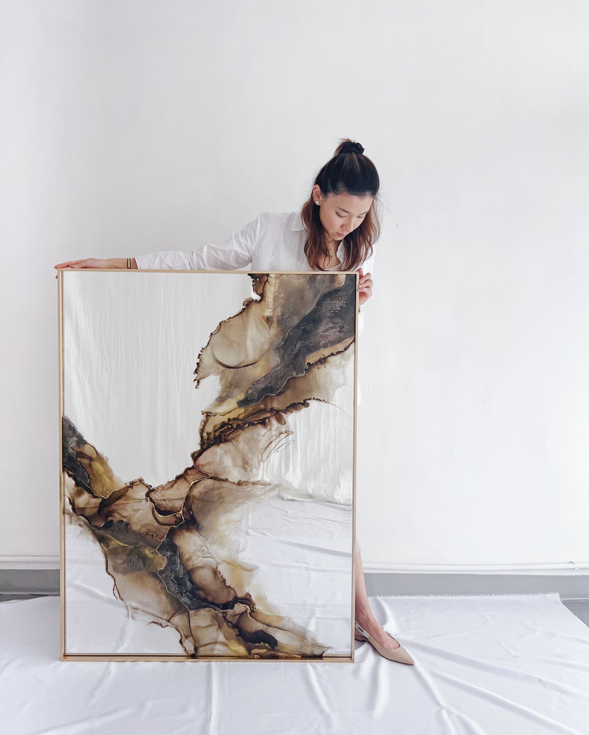 Note: These images are taken under studio lighting staged in an all white surrounding to best showcase the artwork's details and to minimize anything reflecting off the artwork's glossy finish and mirror canvas. Please note that what is displayed on the screen here can have color discrepancies based on the environment and lighting the artwork is housed in.