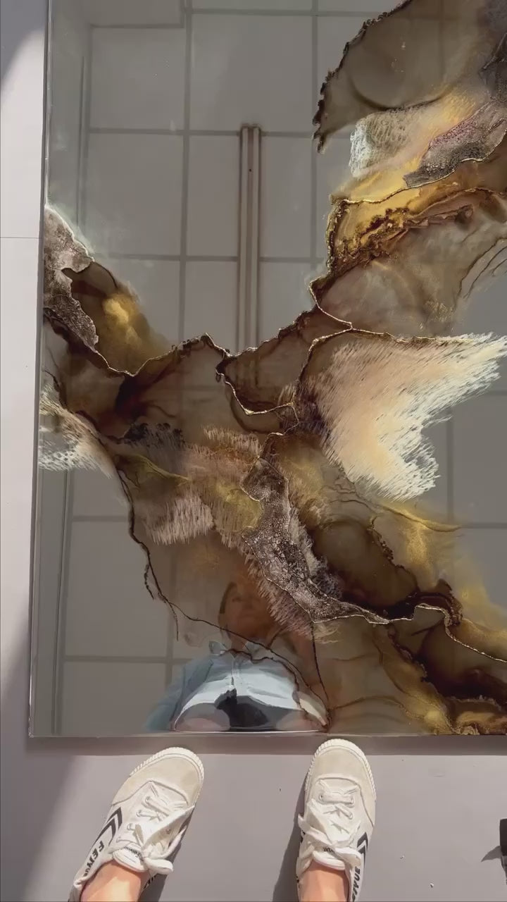 Ink, acrylic, resin, gold leaf foil on mirror