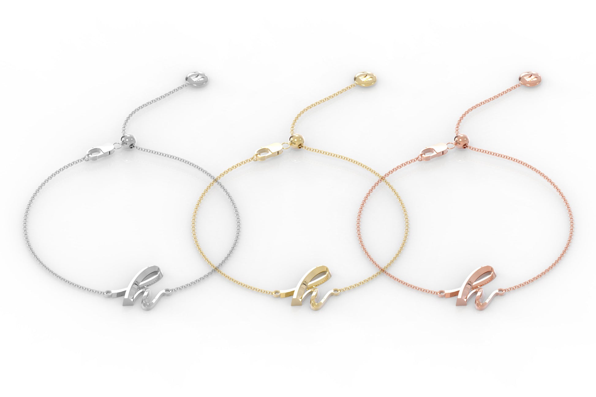 Delicate letter bracelets in Joyce Chiang's signature calligraphy script. A perfect personalized gift for the special women in your life - be it bridesmaids, mom, sister, partner or your closest girlfriends.